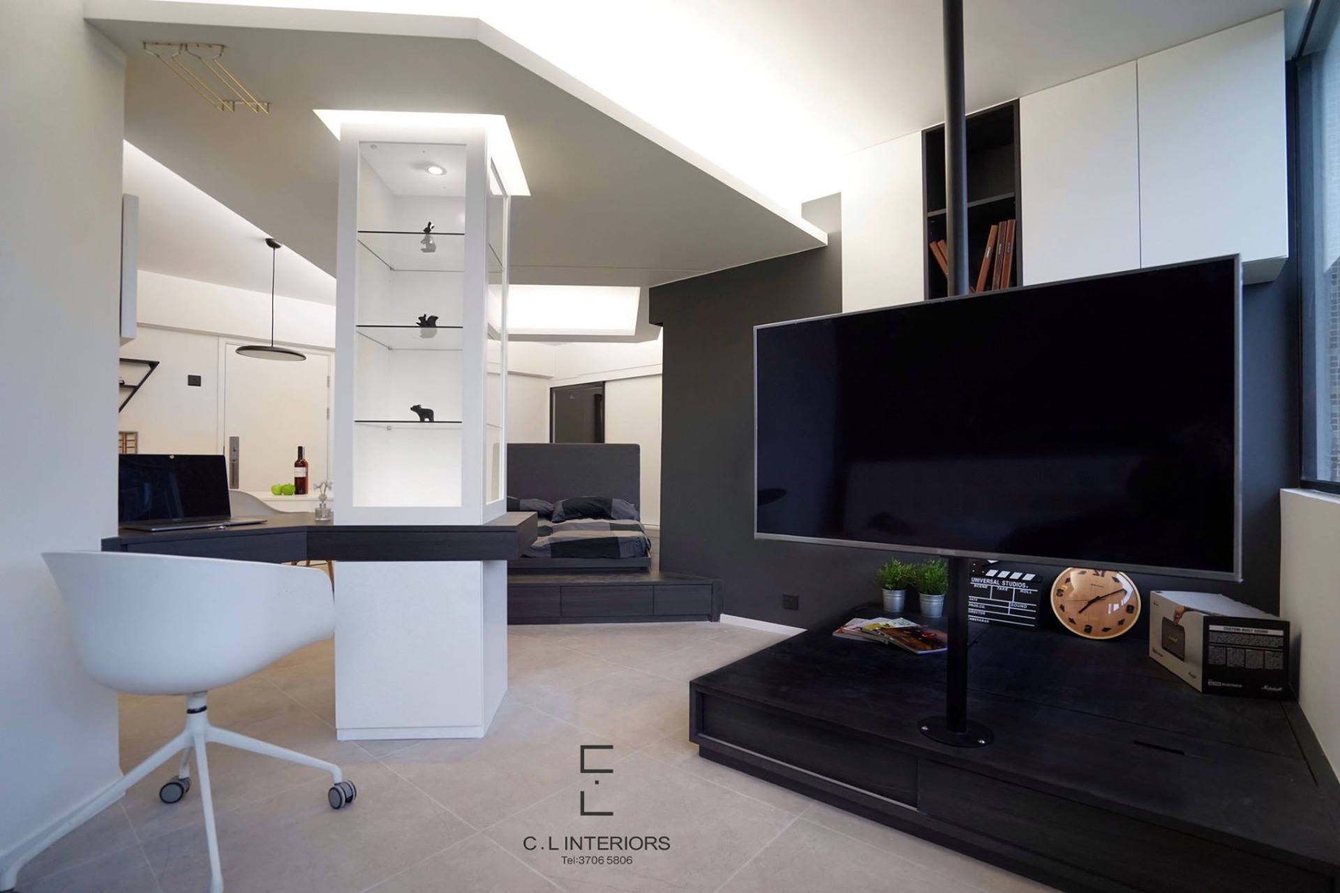 因居住人數減少,充足空間能提升生活水平。全開放的間隔,趣味性的空間規劃,配合形格色系,帶出酒店式度假感覺。中央位置柱型嘅飾櫃擔任空間嘅指揮家,明確分間客廳的及飯廳。